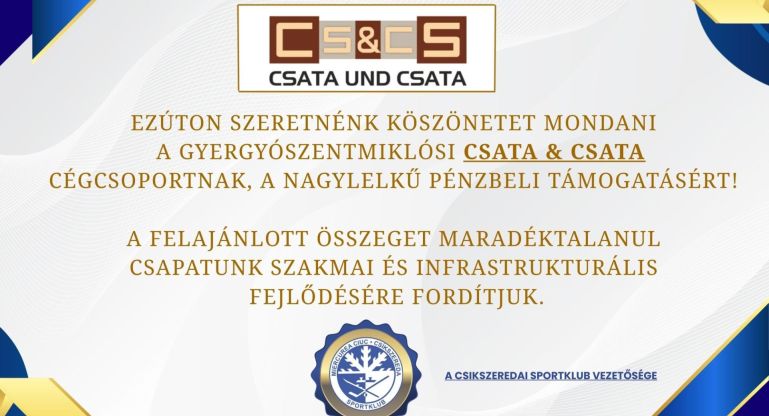 Ezúton szeretnénk köszönetet mondani a gyergyószentmiklósi Csata Und Csata Cégcsoportnak, a nagylelkű pénzbeli támogatásért! Köszönjük a bizalmat! ...